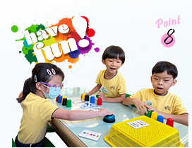 老師透過不同學習範疇的綜合性課程模式,全面「教育」和「照顧」幼兒的學習與成長。日常課堂以中文為主要教學語言。此外,每週安排多次英語會話和英文活動時間,由每級專任的老師任教。每週一次普通話小組時間,由專任老師負責。提升學生對學習兩文三語的興趣,為孩子的語言學習作好準備。