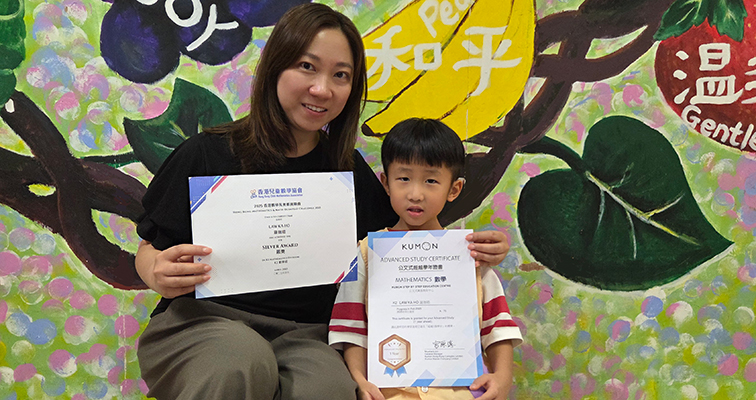 | ▲羅同學榮獲「2025香港數學及奧數挑戰賽」K2數學組銀獎及公文式超越1個學年證書。 |